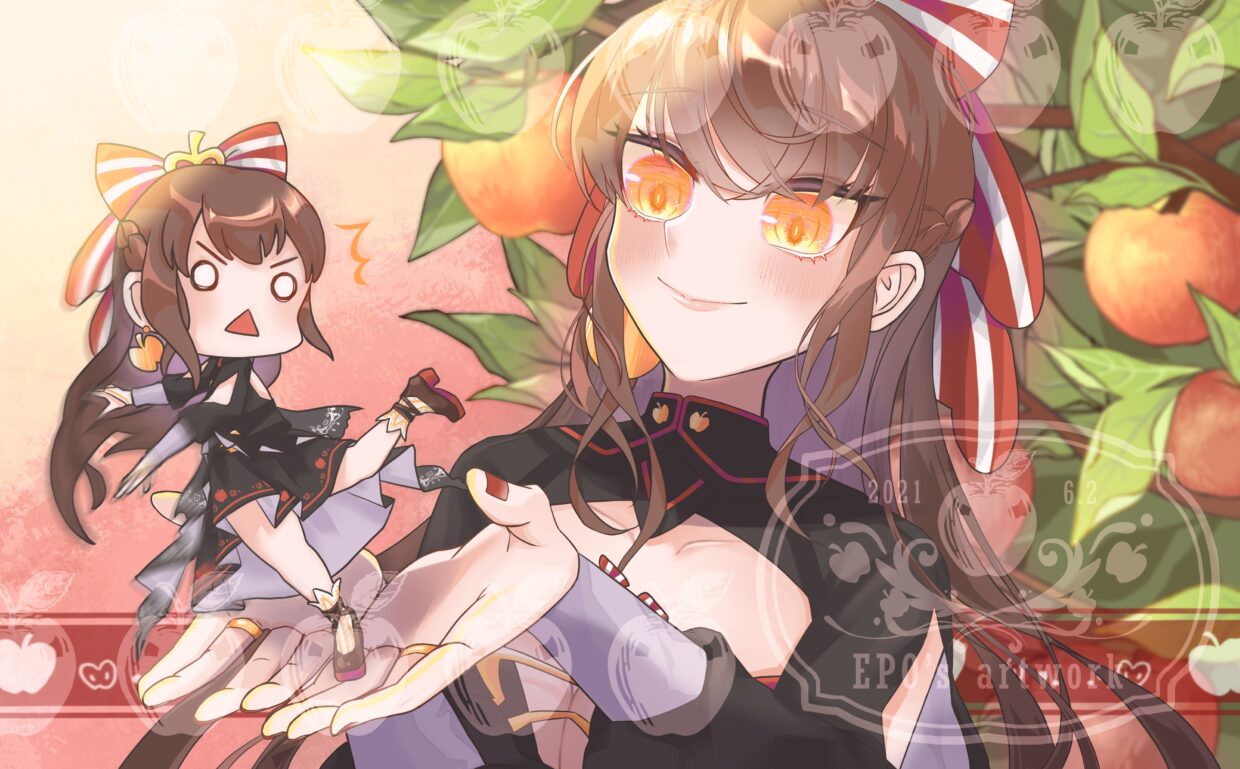 是我自己捧著小小的跌倒EPO,背景畫了結實累累的蘋果樹!