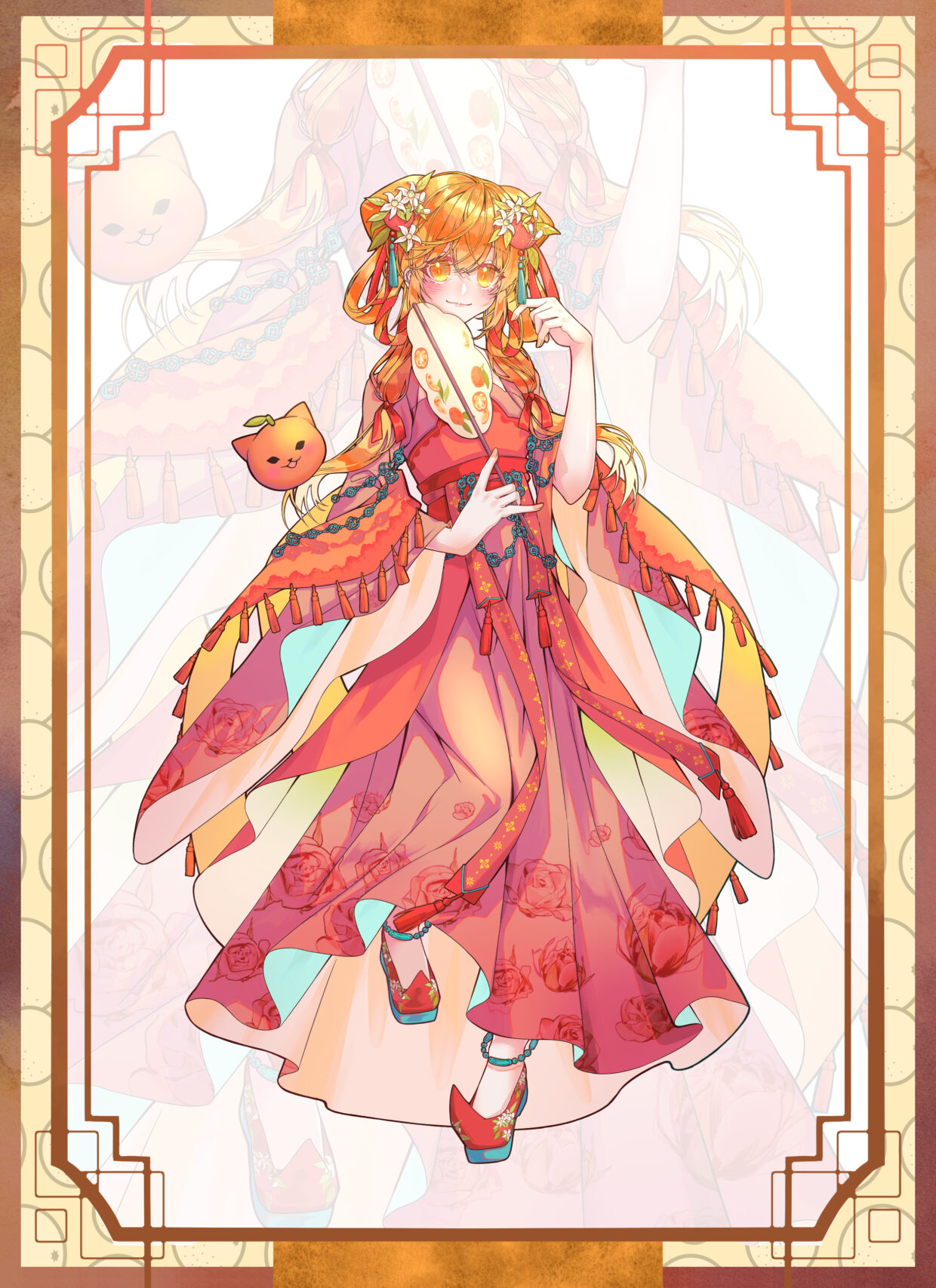 【寒木春華企劃】做了一系列的古風人物設計。小橘的設計元素是橘子、橘子花、玫瑰花。用這些元素來畫的頭飾與裙襬上的花紋。-因為角色裝跟髮色都是橘黃色系,所以做了重點色青綠色的設計,襯在衣服的內側。陰影色選了紫紅色。一樣有用漸層對應。