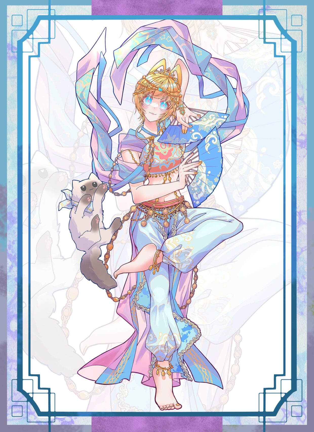 The clothes are in the style of a Dunhuang dancer. Water patterns are added to the fan and trouser legs, and cat patterns are added to the inside of the skirt ~