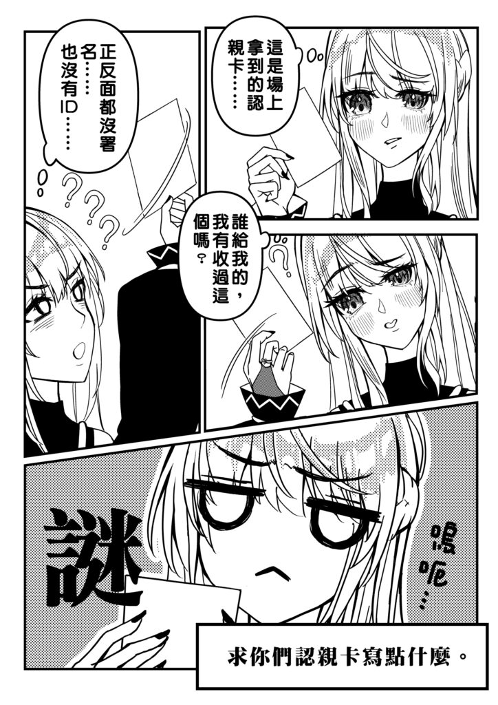 有時候看到畫得很漂亮的認親卡,但是上面只寫了哪一場,然後沒有寫是誰也沒有任何社群連結⋯⋯真的很抱歉🙏我認不出來啊!-時々、素敵な認親カードを見かけますが、どのイベントかしか書かれておらず、誰のものかやSNSのリンクもありません。本当に申し訳ないですが、誰のものか分かりません🙏