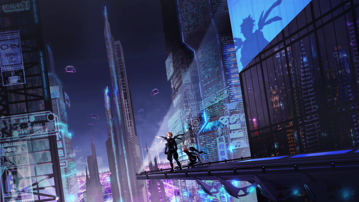 超級難得的場景作品。我想像的未來的場景,是高聳直立的科技都市,人們需要仰賴飛行載具穿梭移動。尤瑞與蜜忒(故事中的男女主角)在畫面的中間準備展開冒險。對於空中要放什麼感到很糾結,做了好幾版。第一次畫大場景,現在看來還有很多可以改進的地方,覺得有點羞恥。打光也是揪結了很久,在畫這張之前完全搞不懂統調的重要性。覺得連色感都變好了呢。考試都考一百分嘞。